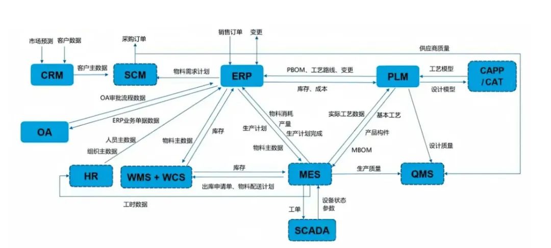 那么如何把智能制造工厂与用户需求、供应链能力连接起来?这就回到了老生常谈的PLM对产品工艺规划数据采集的需求、MES对工厂设备数据采集的需求、ERP对发票和单据数据采集的需求、WMS对入出库物料数据采集的需求、CRM/SRM对上下游数据采集的需求……
