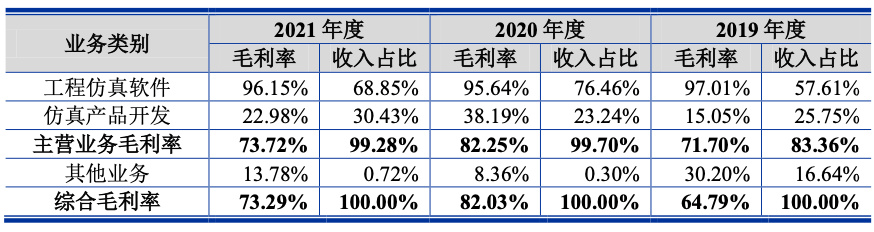 从业务和产品上看,索辰科技主营业务为CAE软件产品的研发、销售及服务,主营产品分为两大类,工程仿真软件和仿真产品开发。工程仿真软件是纯软件产品,为通用型的仿真工具软件,是公司核心技术的集中体现。报告期各期,该类产品收入占主营业务收入的比重超过60%,毛利率较高,超过95%。2019年、2020年及2021年,公司工程仿真软件产品的销售占比分别为 57.61%、76.46%和68.85%,公司综合毛利率随该类产品销售占比的变动而有所波动,2020年综合毛利率上升,2021年下降。
