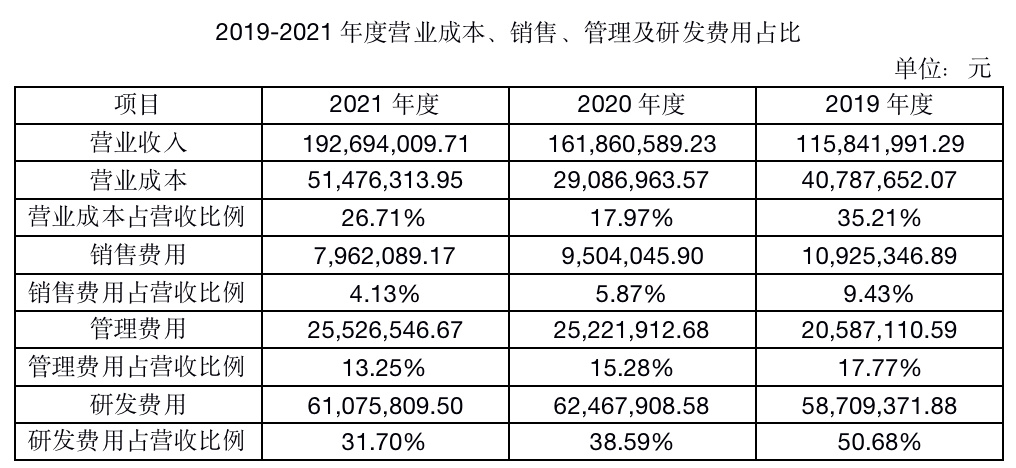 2019年,索辰科技营业成本占营收比例达35.21%,在接下来快速发展的两年中,营业成本有所控制,其中,销售费用也呈逐年下降态势,管理费用逐年增长,研发费用降低。在成本结构上,索辰科技由原先的研发费用占主力达50.68%,转变为逐渐缩小其与营业成本之间的差距,到了2021年,索辰科技的营业成本占营收比例为26.71%,而研发费用比例只有31.70%。