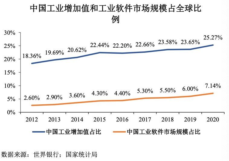 2020年,全球工业软件市场规模达到4358亿美元;中国工业软件市场规模为人民币1974亿元,我国工业软件市场规模仅为全球的7.14%,但我国工业增加值占全球比重却接近 30%,两者严重不相符,存在近3倍的差距。