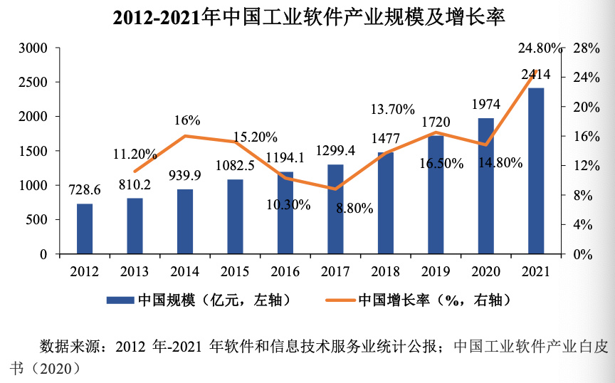 2012 年以来,制造业进入了新旧动能加速转换的关键阶段,全球工业软件产业稳步增长,中国工业软件市场更是呈现出快速发展的态势,我国每年的高制造业增加值为国内工业软件企业提供广阔发展空间。2021年,我国工业软件产品收入2414亿元,较2020年增长24.8%。